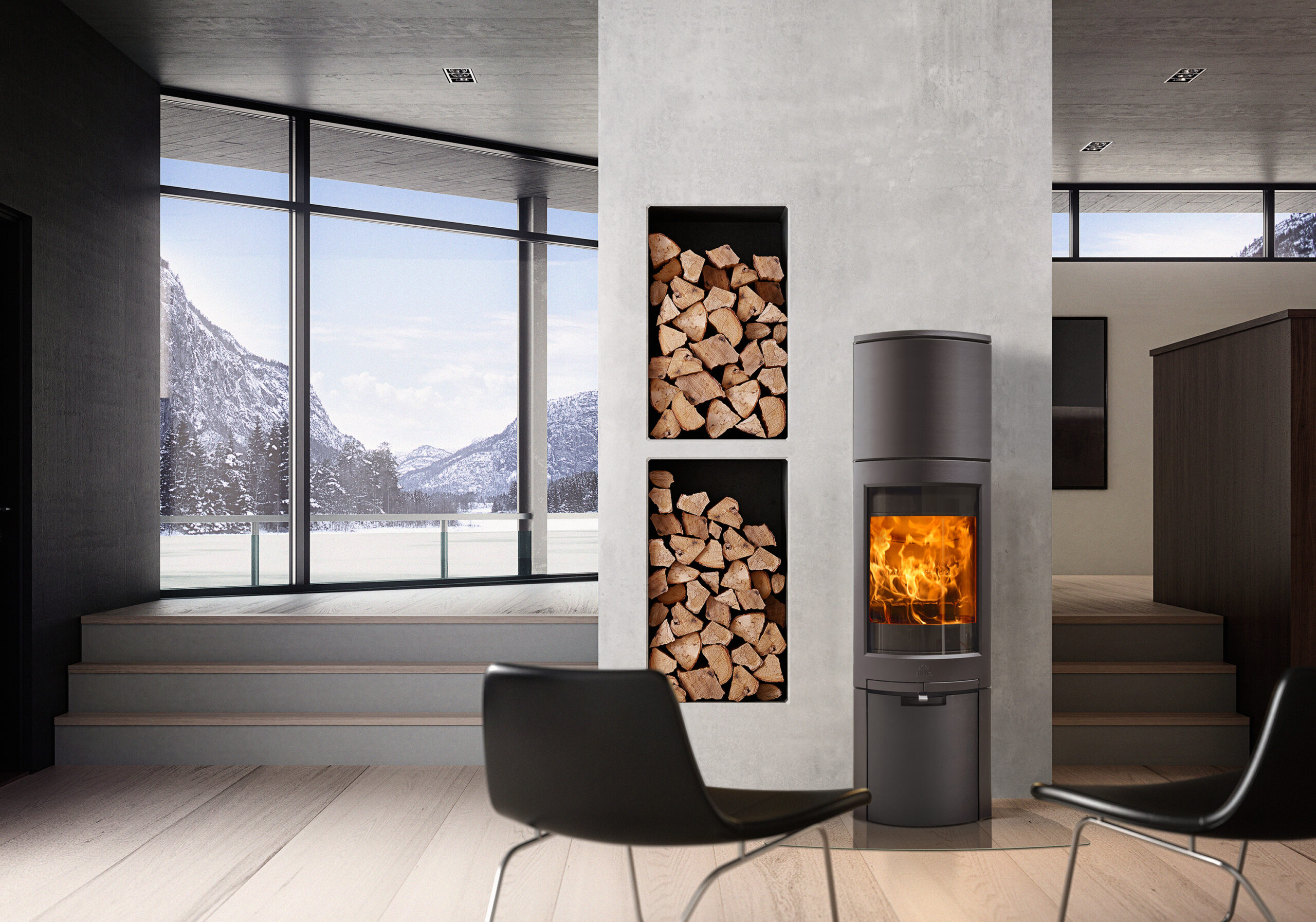 Høy vedovn i solid støpejern, med mulighet for varmelagrende stein i toppen. Denne vedovnen er utstyrt med en brukervennlig ergonomisk ‘Stay’-funksjon som holder døren åpen når du legger i ved. I tillegg har den luftspyling som gjør at glasset holder seg renere. Den kan også tilpasses ved å legge til dreiesett, slik at du kan nyte utsikten til flammene fra flere steder i rommet. Bak en solid dør av støpejern i sokkelen, skjuler det seg et rom perfekt for oppbevaring av mindre ved og tennbriketter til opptenning, eller annet utstyr som peisvott og lighter.