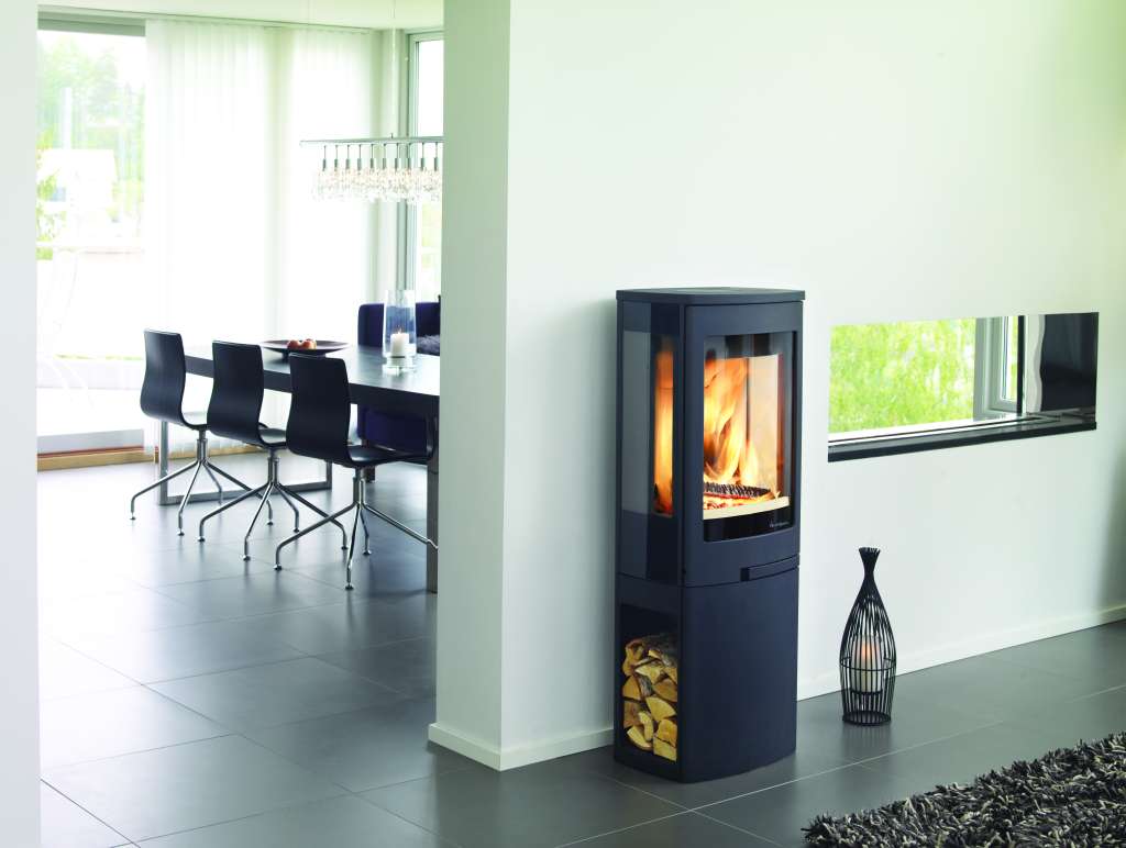 Nordpeis Duo 2 har sideglass som gir flott innsyn til flammebildet. Peisovnen har en praktisk vednisje til oppbevaring av veden i siden. Designet av Ingvild W. Mørk og Karoline Bommen i elegant og stilren form.